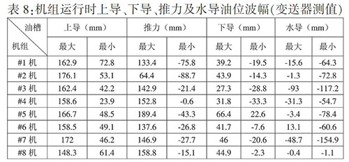 從表8可以看出,上導(dǎo)波幅均在靜態(tài)油位以上,容易出現(xiàn)高油位報(bào)警;推力和下導(dǎo)油槽油槽波幅均上下跨越靜態(tài)油位,容易出現(xiàn)高油位、低油位報(bào)警;水導(dǎo)油槽波幅在靜態(tài)油位以下,容易出現(xiàn)低油位報(bào)警。