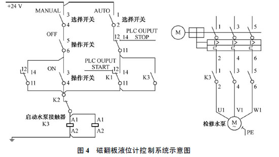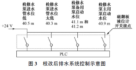 現(xiàn)場安裝石灰液位計(jì)時, 裝置標(biāo)尺的0 位, 對應(yīng)的實(shí)地高程為EL .40 .0 m 。浮子開關(guān)設(shè)定5 個水位動作值, 檢修水位低開關(guān)量報(bào)警值對應(yīng)的高程為40 .3 m ;停止所有檢修水泵的開關(guān)量, 所對應(yīng)的高程為40 .5 m ;啟動主用檢修水泵的開關(guān)量, 所對應(yīng)的高程為40 .9 m ;啟動檢修水泵主用泵的開關(guān)量, 以及要求手動啟動大泵, 并作為水位高報(bào)警上送上位機(jī), 所對應(yīng)的高程為41 .1 m 與41 .2 m , 兩個開關(guān)量并列接入。全部開關(guān)量分別送入PLC , 如圖3所示。