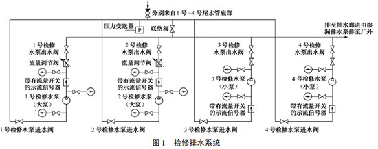 桐柏電站的檢修排水系統(tǒng), 共設4 臺排水泵, 如圖1 所示, 1 號、2 號檢修水泵(大泵)用于排空引水隧洞、蝸殼、尾水管、尾水隧洞內(nèi)的水;3 號、4 號檢修水泵(小泵)用于球閥、上下庫閘門等的滲漏排水。每臺檢修水泵均配置逆止閥、壓力表和帶流量開關的示流信號器, 在1 號、2 號水泵出水管處各安裝了一個流量調(diào)節(jié)閥。系統(tǒng)中共有2 根總管, 一根為水泵的總吸水管, 包括從每臺機組尾水管底部至總管的支管, 總吸水管和部分支管及管路上的操作閥門布置在廠房管路廊道中;另一根為總排水管, 可將水排至滲漏集水井中, 再經(jīng)滲漏排水泵排至下庫。