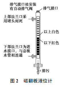 由于在丙酸液位計的進水接口法蘭處安裝有閥門, 在平時不需要水泵水輪機排水檢修時, 該閥門處于關閉狀態(tài), 必要時可以通過裝置底部的排污閥門把液位計主導管內(nèi)的水排空。