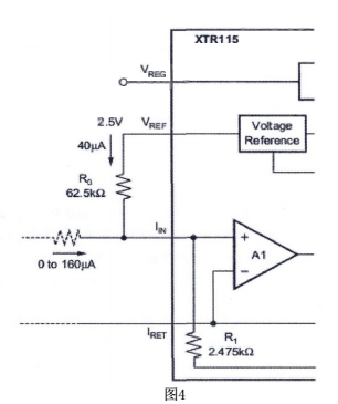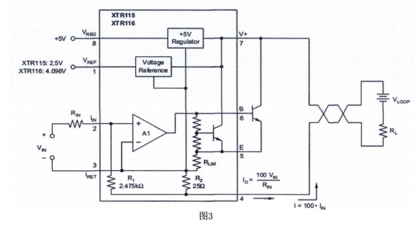 把傳感器輸出的不同電壓轉(zhuǎn)換成標(biāo)準(zhǔn)的4-20ma輸出,可采用不同的電路形式。成本低的可采用分立器件,但是為了達(dá)到比較高的精度,要保證相應(yīng)器件的匹配程度,調(diào)試也比較麻煩。TI公司推出的XTR 系列工業(yè)傳感器專用的4-20ma的一體化變送器集成電路,采用該系列產(chǎn)品設(shè)計的變送器成本低,精度高,調(diào)試簡單。經(jīng)過選擇決定使用XTR115完成設(shè)計。內(nèi)部結(jié)構(gòu)如圖三: