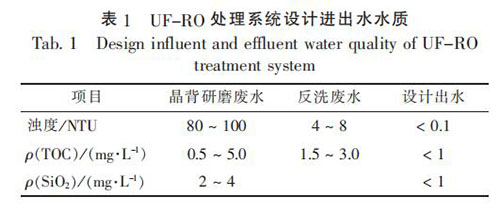 國內(nèi)某磁翻板液位計廠, 晶背研磨廢水產(chǎn)生量為 150 ~160 m3 / d, 反洗廢水產(chǎn)生量 為 500 ~ 700 m3 / d, 主要污染物為懸浮物, UF-RO 處理系統(tǒng)設(shè)計進(jìn)水和出水主要水質(zhì)指標(biāo)見表 1。