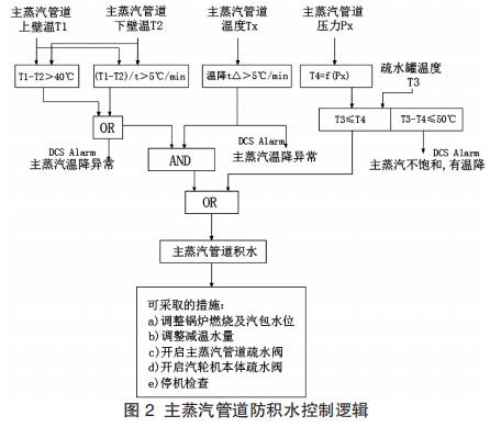 結(jié)合主蒸汽管道積水的上下壁溫差法與疏水罐測溫法結(jié)合自動檢測方法, 主蒸汽管道防積水可以采用如圖 2 所示中的控制邏輯與策略。