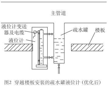液位計測量桿反向安裝后,變送器和接線盒位于樓板上部,反裝后示意圖如圖2所示。維護時變送器位于接近地面的位置,易于到達,不存在高處作業(yè)風(fēng)險,不需要搭建腳手架,工作流程也能得到簡化。