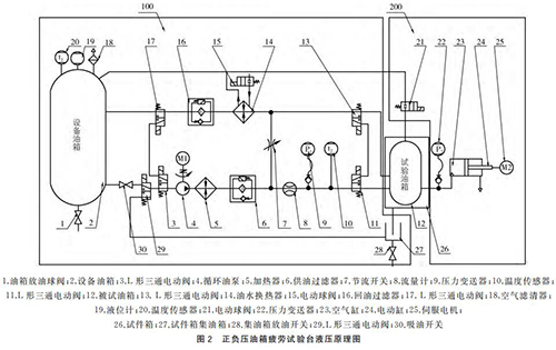 (1)循環(huán)油液控制回路,如圖2中100部分。這個部分主要由“保溫油箱、液位計、過濾器、循環(huán)油泵、加熱器、流量計、電動三通閥、油水換熱器、液體液位計、溫度傳感器等組成”;被試油箱滑油供回油口連接在試件箱內供油軟管和回油軟管之間,即可對被試油箱內部油液流動要求及溫度進行控制。