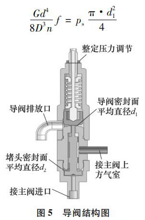 忽略重力和摩擦力因素的影響,對導(dǎo)閥的動作過程進(jìn)行受力分析,導(dǎo)閥結(jié)構(gòu)如圖 5 所示。當(dāng)系統(tǒng)壓力升高達(dá)到整定壓力時,氣體在導(dǎo)閥密封面處克服導(dǎo)閥彈簧預(yù)緊力向上頂起導(dǎo)閥的閥芯,此時應(yīng)滿足: