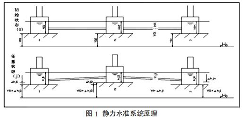 靜力水準(zhǔn)儀依據(jù)連通管的原理,采用振弦式傳感器,測(cè)量每個(gè)測(cè)點(diǎn) 容器內(nèi)液面的相對(duì)變化,再通過計(jì)算公式求得相對(duì)于基準(zhǔn)點(diǎn)的沉降量,如圖 1 所示。