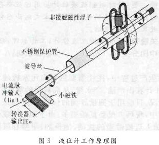 其工作原理是利用磁場脈沖波,測量時(shí)液位計(jì)的頭部發(fā)出電流“詢問脈沖”,此脈沖同時(shí)產(chǎn)生磁場,沿波導(dǎo)管內(nèi)的感應(yīng)線向下運(yùn)行,在液位計(jì)管外配有浮子,浮子可隨液位沿側(cè)桿上下移動(dòng),浮子內(nèi)設(shè)有一組永久磁鐵,其磁場與脈沖產(chǎn)生的磁場相遇則產(chǎn)生一個(gè)新的變化磁場,隨之產(chǎn)生新的電磁“返回脈沖”,測定“詢問脈沖”和“返回脈沖”的周期便可知道液位的變化。因此,磁致式液位計(jì)是以浮子為測量元件通過磁耦合的變化傳遞到指示器,使指示器能夠清晰地指示出液位的高度。