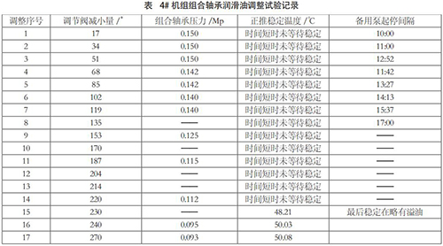 (4)方案四:調(diào)整組合軸承潤(rùn)滑油量經(jīng)過主機(jī)制造廠設(shè)計(jì)部計(jì)算復(fù)核,認(rèn)為現(xiàn)有油泵有可能滿足冷卻要求。經(jīng)過與電廠溝通,聯(lián)合制定了減少組合軸承用油量的試驗(yàn)方案。主要措施為:在組合軸承供油管調(diào)節(jié)閥后組合軸承前增加一壓力表,用于監(jiān)視組合軸承供油壓力。機(jī)組在滿負(fù)荷運(yùn)行條件下,分階段逐步調(diào)整節(jié)流閥減少供油量,監(jiān)視記錄組合軸承供油壓力和組合軸承溫度,直到單臺(tái)油泵滿足用油量略有余量、備用泵處于備用狀態(tài)下,正向推力瓦*高溫度控制 55℃以內(nèi)。*后恢復(fù)單冷卻器運(yùn)行和環(huán)境溫度*高條件下檢驗(yàn)軸承溫度。
