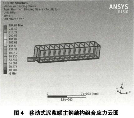 (2)考慮在使用過程中,可能出現(xiàn)兩個滿載的相同泥漿罐疊放的*端工況,因此底部泥漿罐在滿載的情況下還要承受上部相同尺寸的滿載泥漿罐的自重。將上部滿載泥漿罐的自重等效為加載在下部泥漿罐頂結(jié)構(gòu)的均布壓力其中,見為滿載泥漿槽自重,識=168782x9.81=1655752為儲存罐頂部方管的長度乂=29.丨8111。因此/^56.8犯11?。