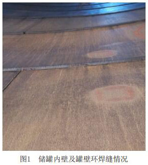 儲(chǔ)罐結(jié)構(gòu)型式為拱頂罐,罐壁的環(huán)焊縫為搭接結(jié)構(gòu),其罐壁的焊縫均沒(méi)有進(jìn)行處理,有一定的焊縫余高,罐體內(nèi)直徑隨著高度的增加直徑在變小。儲(chǔ)罐原為原油儲(chǔ)罐,雖然經(jīng)過(guò)蒸汽吹掃,罐壁上仍附著油污,罐內(nèi)的防腐層破壞嚴(yán)重。儲(chǔ)罐在制造時(shí),對(duì)鋼板的內(nèi)表面要求處理的粗糙度等級(jí)不高,使內(nèi)壁殘留許多小的焊瘤、焊渣等,該類殘留物部分有鋒利的銳角。其具體情況如圖1所示。