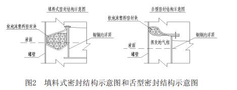 鋼制內(nèi)浮頂與罐壁之間的密封通常采用彈性材料密封結(jié)構(gòu),根據(jù)彈性密封件的結(jié)構(gòu)和斷面尺寸,密封的結(jié)構(gòu)形式主要可以分為填料式密封和舌型密封結(jié)構(gòu)兩大類。兩者的密封結(jié)構(gòu)示意見(jiàn)圖2: