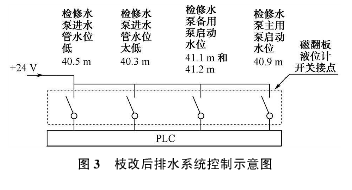 它結(jié)構(gòu)是利用旁通管的原理,主導(dǎo)管內(nèi)的液位和尾水管內(nèi)的液位高度一致,根據(jù)阿基米德定理,磁性浮子在液體中產(chǎn)生的浮力和重力平衡,當(dāng)尾水管中的水位升降時(shí),液位計(jì)主導(dǎo)管內(nèi)的浮子也隨之升降,浮子內(nèi)的永久磁鐵通過(guò)磁耦合驅(qū)動(dòng)指示器內(nèi)的翻板指示器,當(dāng)液位上升或下降時(shí),翻板指示器由白色翻轉(zhuǎn)為紅色,或由原來(lái)的紅色翻轉(zhuǎn)為白色,指示器的顏色改變的高度就是被測(cè)水位的實(shí)際高度,從而實(shí)現(xiàn)液位的現(xiàn)場(chǎng)指示,以供運(yùn)行人員目測(cè)尾水管的實(shí)時(shí)水位。安裝于液位計(jì)管壁外側(cè)的磁記憶開(kāi)關(guān),可多點(diǎn)設(shè)置、滑動(dòng)調(diào)整位置,提供了液位開(kāi)關(guān)量報(bào)警功能。在裝置的頂部安裝了一個(gè)自動(dòng)排氣裝置,當(dāng)主導(dǎo)管內(nèi)液位上升時(shí)能夠自動(dòng)的排氣,下降時(shí)能夠按時(shí)補(bǔ)氣?,F(xiàn)場(chǎng)安裝耐高溫磁翻板液位計(jì)時(shí),裝置標(biāo)尺的0位,對(duì)應(yīng)的實(shí)地高程為EL.40.0m。浮子開(kāi)關(guān)設(shè)定5個(gè)水位動(dòng)作值,檢修水位低開(kāi)關(guān)量報(bào)警值對(duì)應(yīng)的高程為40.3m;停止所有檢修水泵的開(kāi)關(guān)量,所對(duì)應(yīng)的高程為40.5m;啟動(dòng)主用檢修水泵的開(kāi)關(guān)量,所對(duì)應(yīng)的高程為40.9m;啟動(dòng)檢修水泵主用泵的開(kāi)關(guān)量,以及要求手動(dòng)啟動(dòng)大泵,并作為水位高報(bào)警上送上位機(jī),所對(duì)應(yīng)的高程為41.1m與41.2m,兩個(gè)開(kāi)關(guān)量并列接入。全部開(kāi)關(guān)量分別送入PLC,如圖3所示。