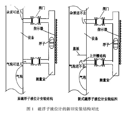 圖1四氟磁翻板液位計(jì)的新舊安裝結(jié)構(gòu)對比氣相總是要向上方或斜上方運(yùn)動(dòng),這樣,氣相就不能置換掉下部接管中的液相,也就不能進(jìn)人液位計(jì)測量室,就避免了氣泡對測量的干擾以及“亂磁”現(xiàn)象的產(chǎn)生。
