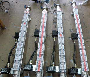 在液位計立管上由用戶設定上、下限位置安裝控制器,控制器內(nèi)帶有自保持作用的舌簧開關,利用磁性浮子隨液位移動使簧片開關動作時,實現(xiàn)報警或限位控制。